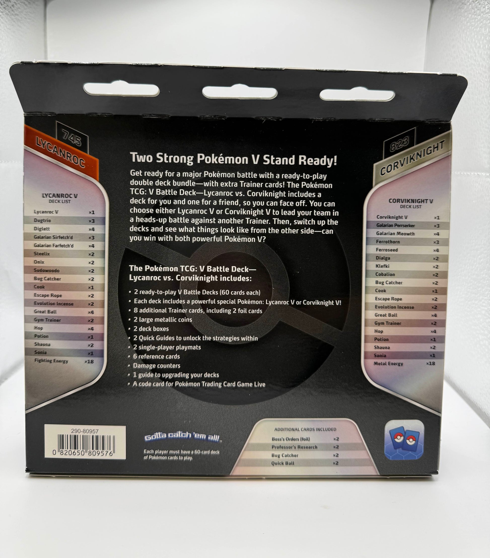 Unleash the clash of fangs and steel with the Pokémon TCG: Lycanroc V vs Corviknight V Battle Decks! This powerful two-deck set features the fierce Lycanroc V and the armored Corviknight V, each leading a full 60-card deck designed for head-to-head battles right out of the box. Perfect for players looking to master Pokémon V strategies or collectors seeking a sealed display of iconic Pokémon.
