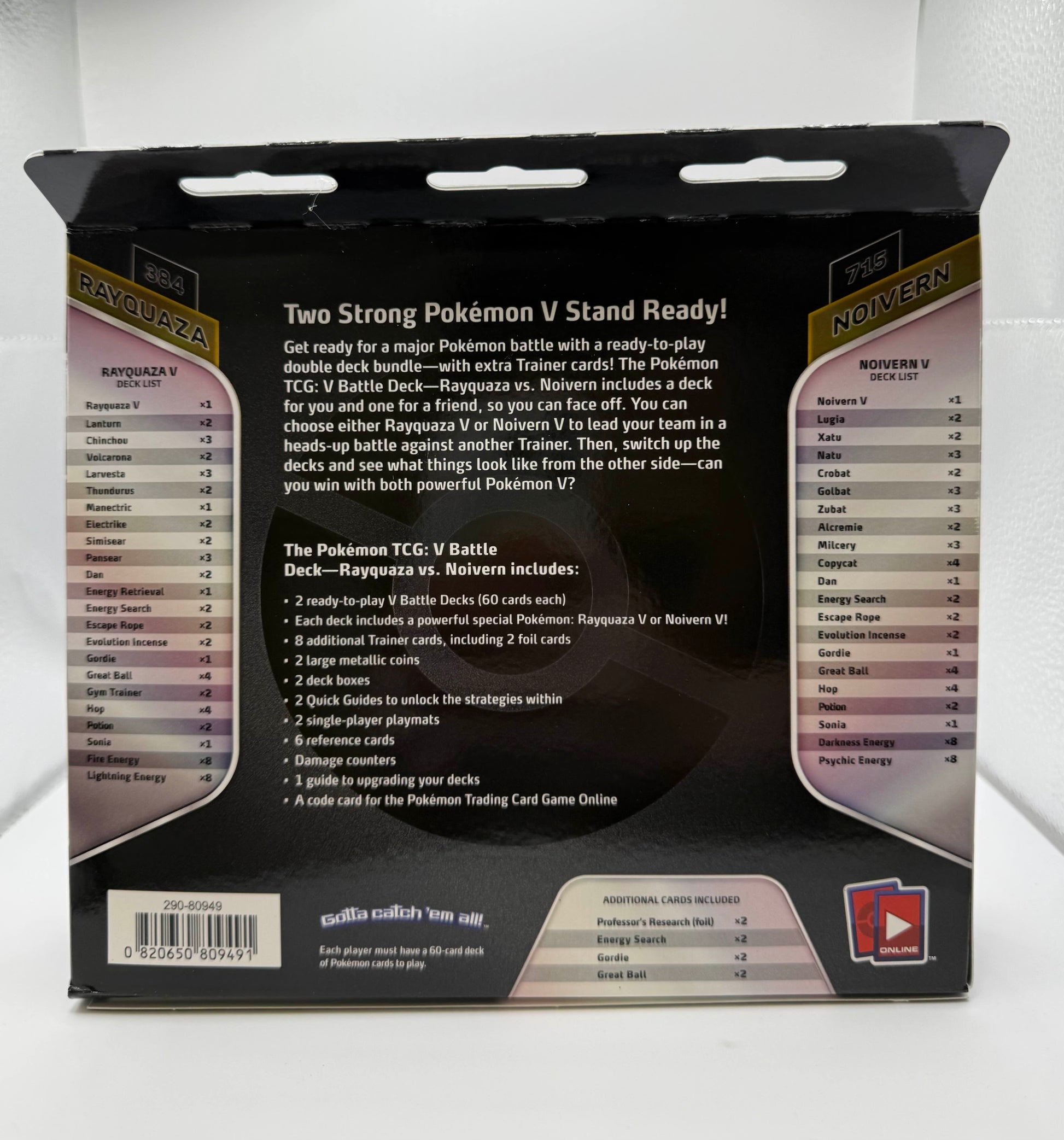 Take your battles to new heights with the Pokémon TCG: Rayquaza V vs Noivern V Battle Decks! This dynamic double pack features two fully built decks showcasing the legendary Rayquaza V and the stealthy Noivern V—ready for fast-paced duels straight out of the box. Perfect for friendly battles, collectors, or players who want a quick, balanced matchup experience.